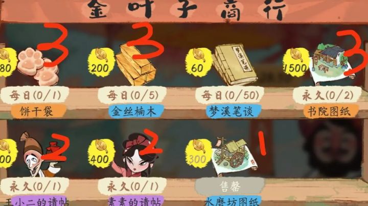 大家晚上好!开服已经过去10个小时了,大伙都到了今日等级上限7级了吧据说一些大肝帝不仅把等级提到最高还把仓库填满了!!老余我瑟瑟发抖作为山水集的忠实粉丝,这里给大家带来所有商店(没错,你能在游戏里见到所有能用货币兑换的商店通通都有!)的购买建议附:图片红色数字表示购买优先级一、杂货摊首先,性价比最高的是价值1货币的新手大礼包!其次,金丝楠木必买!再然后,如