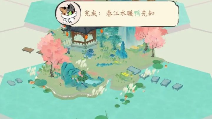 水与鸭子的完成条件应该是把每个水面都靠着岸边并且旋转成露出荷叶的形态竹外桃花三两枝的完成条件就是把桃花放在竹子外面