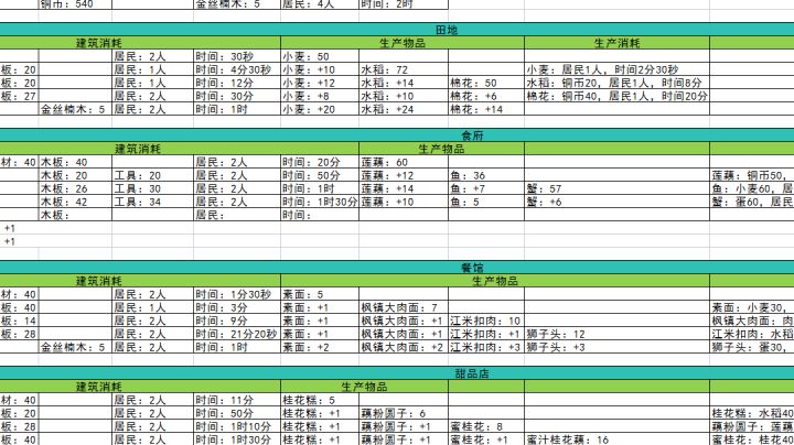 原稿由“予雨与鱼”大佬提供,大佬日理万机无暇顾及游戏,我只是后续做了一些零零碎碎的修补整理工作予雨与鱼和我共创表格耗时耗力,从昨天晚上吃过饭通宵才把表格完善,希望对大家有所帮助~由于更高的等级还未达到,我将在日后逐渐完善如果内测七天时间够用,我也会更新巴蜀的一些建筑表格