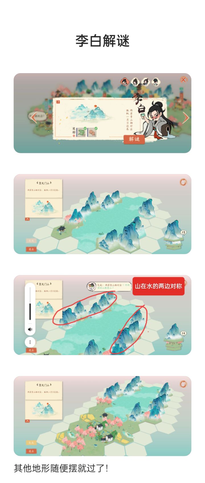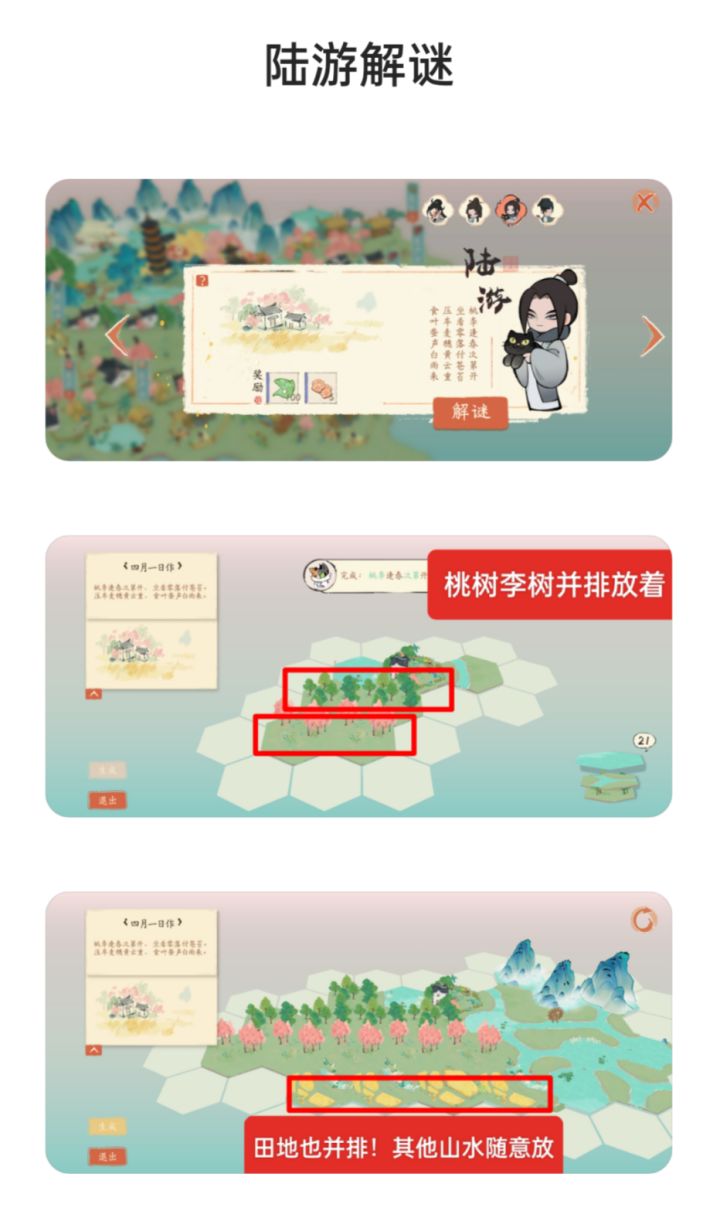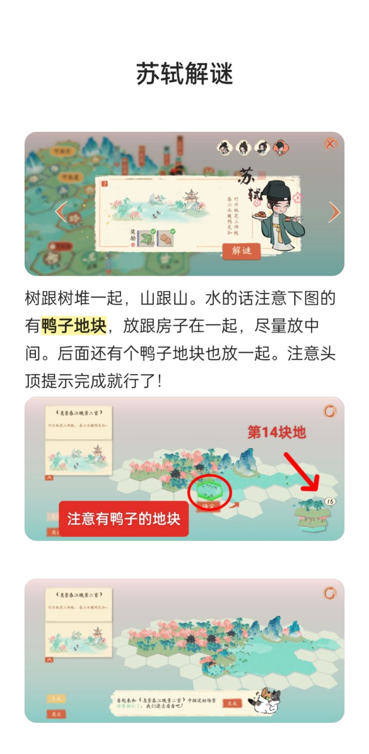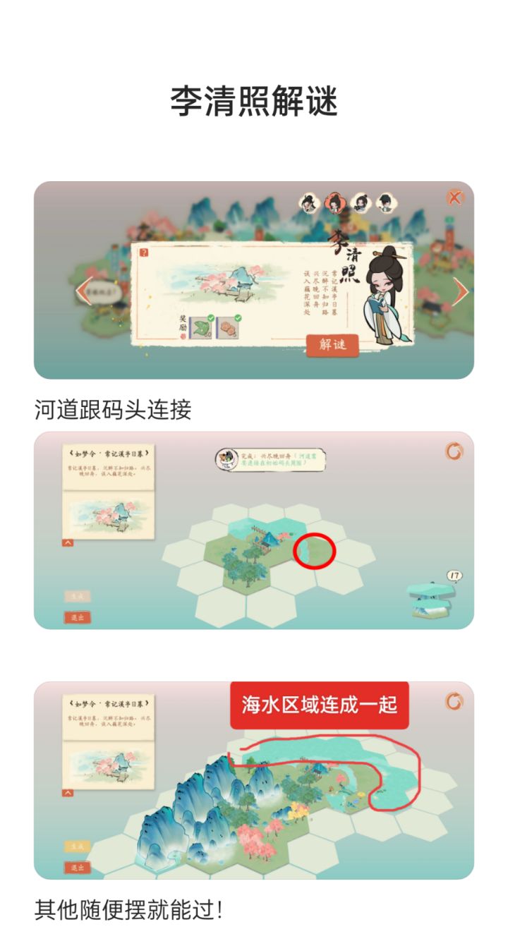 李白的很简单,把几座山排列成两行其余的随便放李清照:可以把水池放成“骨头”形状,满足条件一完成兴尽晚回舟,可以放在初始码头旁边满足条件后提示会变成绿色,反之,不满足为红色新码:DMSSXYYDS淡墨水水乡yyds我没打错,官方那边打错了下方是陆游与苏轼相关的解谜攻略: