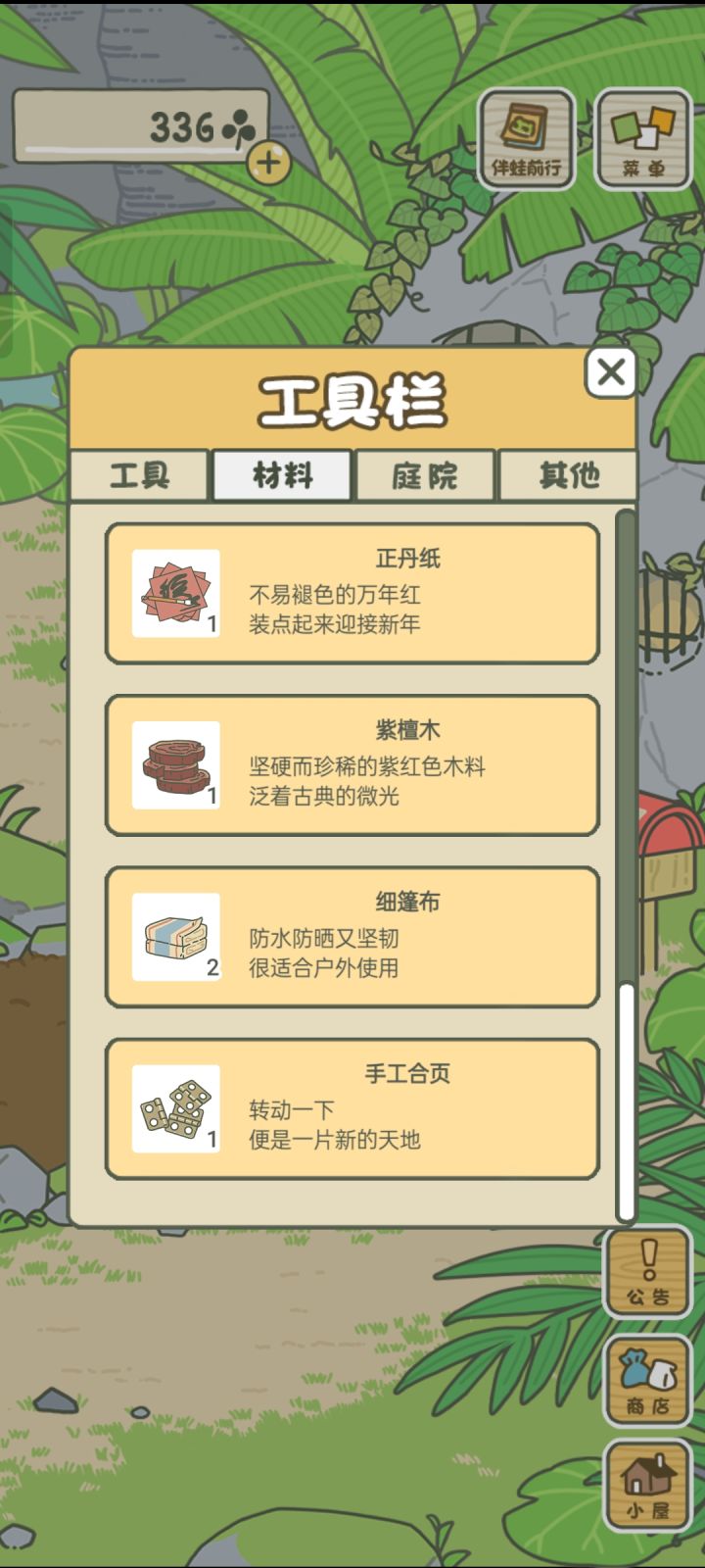 要是晚上景色能改偏蓝黑一点就好了,再在庭院加一盏引路灯,再加个随机下雨天(小雨和大雨),晚上12点之前引路灯亮,凌晨之后萤火虫亮(晚上下雨萤火虫不出来),蛙友们对不对?怎么让官方看到😃😃