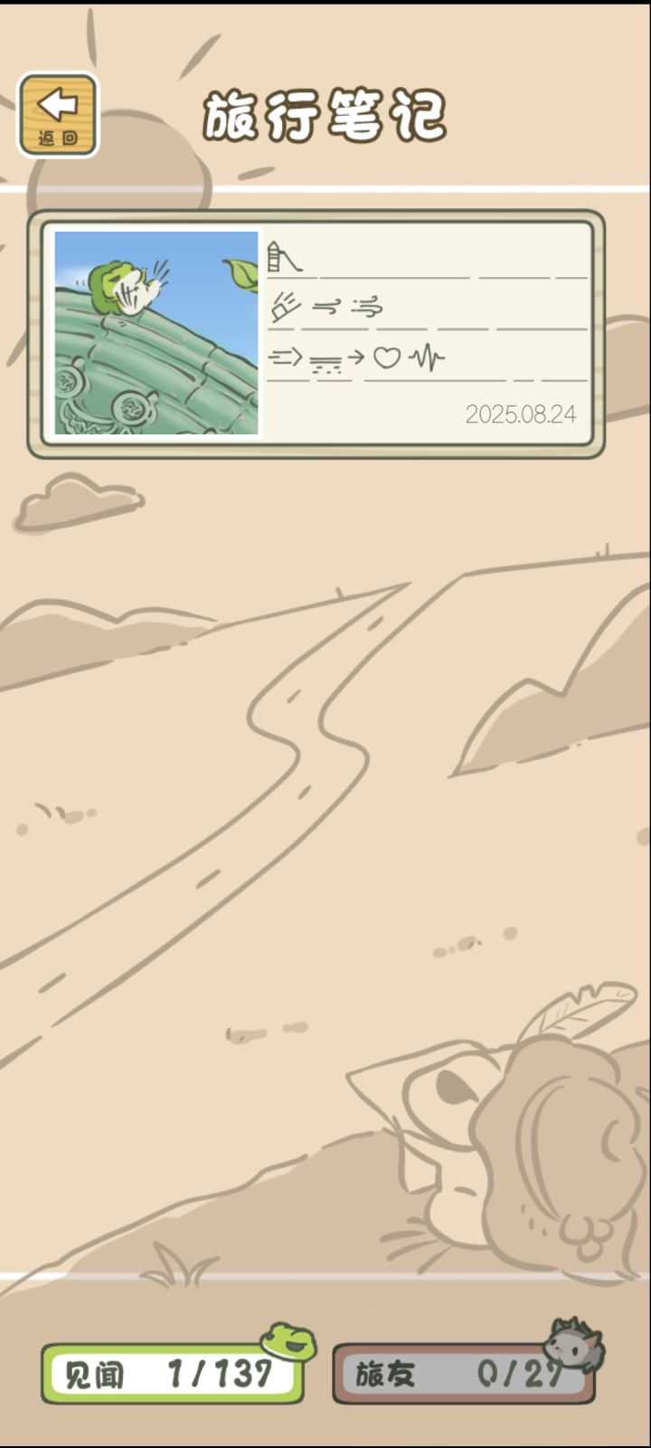 #旅行笔记 旅行青蛙中国之旅 刚开始玩这个游戏很好奇笔记里写了什么看图猜写家滑倒小风,大风前进某个地点遇到喜欢的认识中不知道是不是,你们呢?