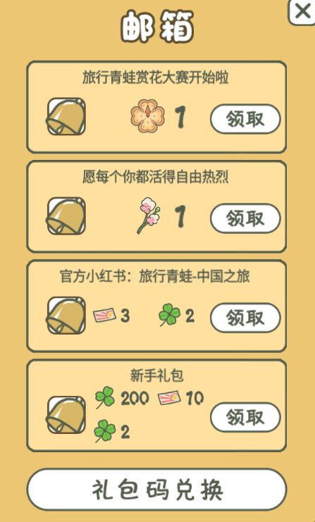 兑换码:WAZAILAILAWAZAIAIMAMACUQJ-EDTJ-HKDV旅行青蛙来小红书啦致敬了不起的你和旅行青蛙一起赏花目前能使用的兑换码,刚兑换完成,大佬们还有什么能领的麻烦补充一下,谢谢😍
