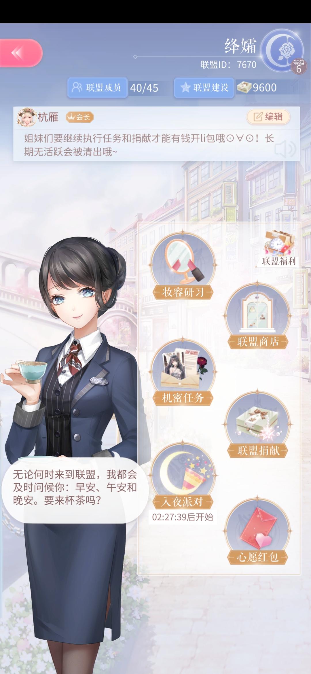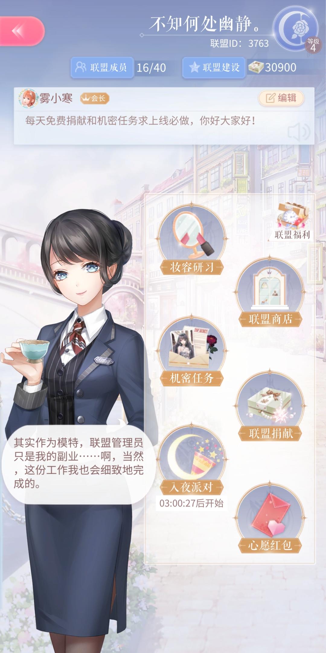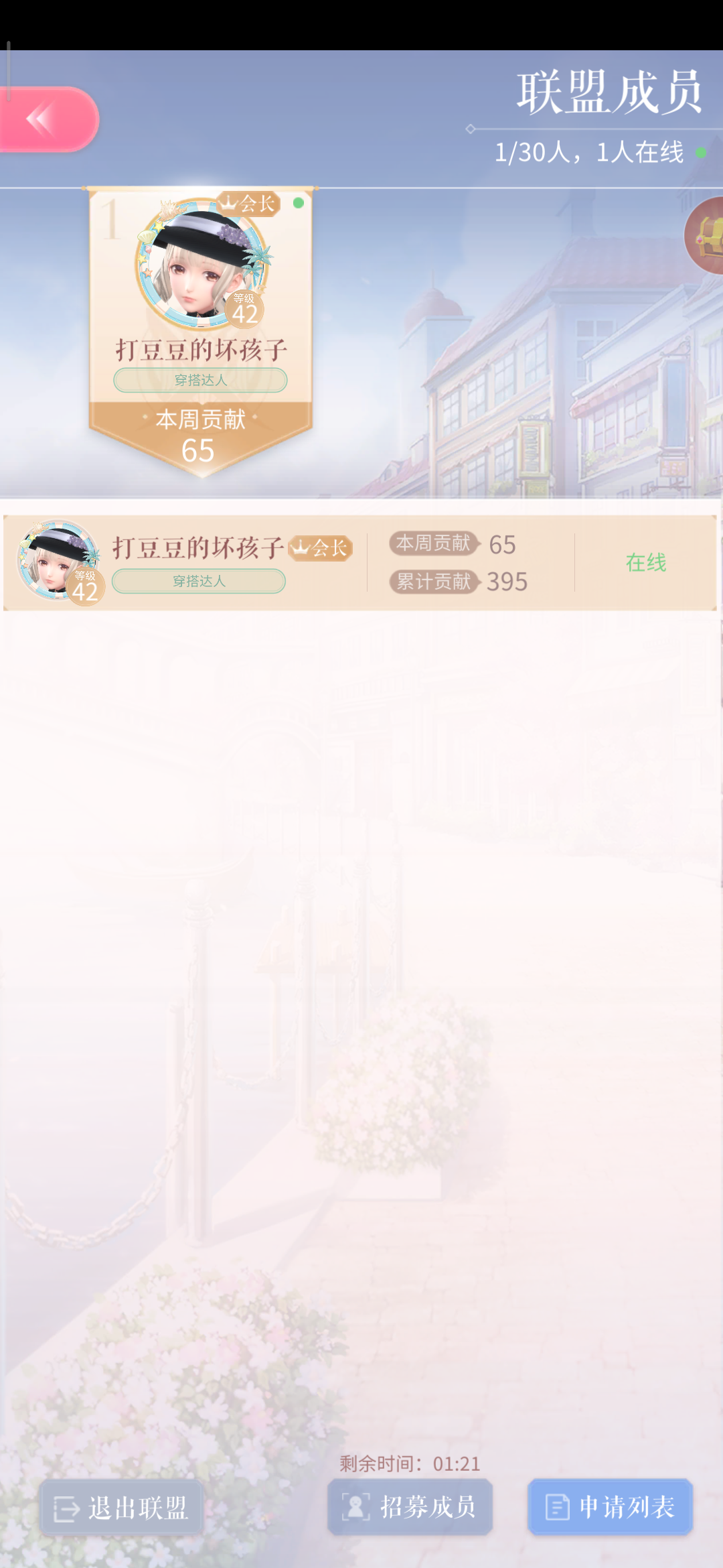 (已解散,记录还是留着吧,哈哈哈哈)这里是一个咸鱼会长,想找一些活跃点成员一起建设联盟我没怎么详细算过维持联盟拿奖励需要多少个活跃的小伙伴,不过来的话都欢迎的说(回头去算算,嘻嘻)(本人是个非洲猛男,深感联盟建设不易,妆容什么的机密任务名次打不上去进度会差一大截)