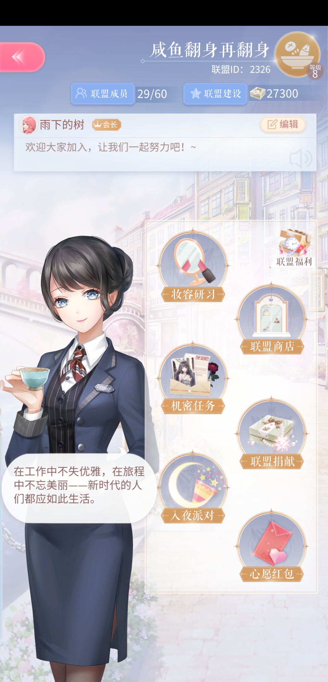 欢迎加入「脱非入欧」9级联盟联盟ID:2652福利:已开三包,小号点灯排名:130左右要求:活跃,每天5次机密任务,搭配力大致达到钻石门槛本联盟相当活跃,每天可以收获一堆堆红包~有意者联系扣扣快落女鹅养成记556488656宙暖镇楼!(偷来的图)