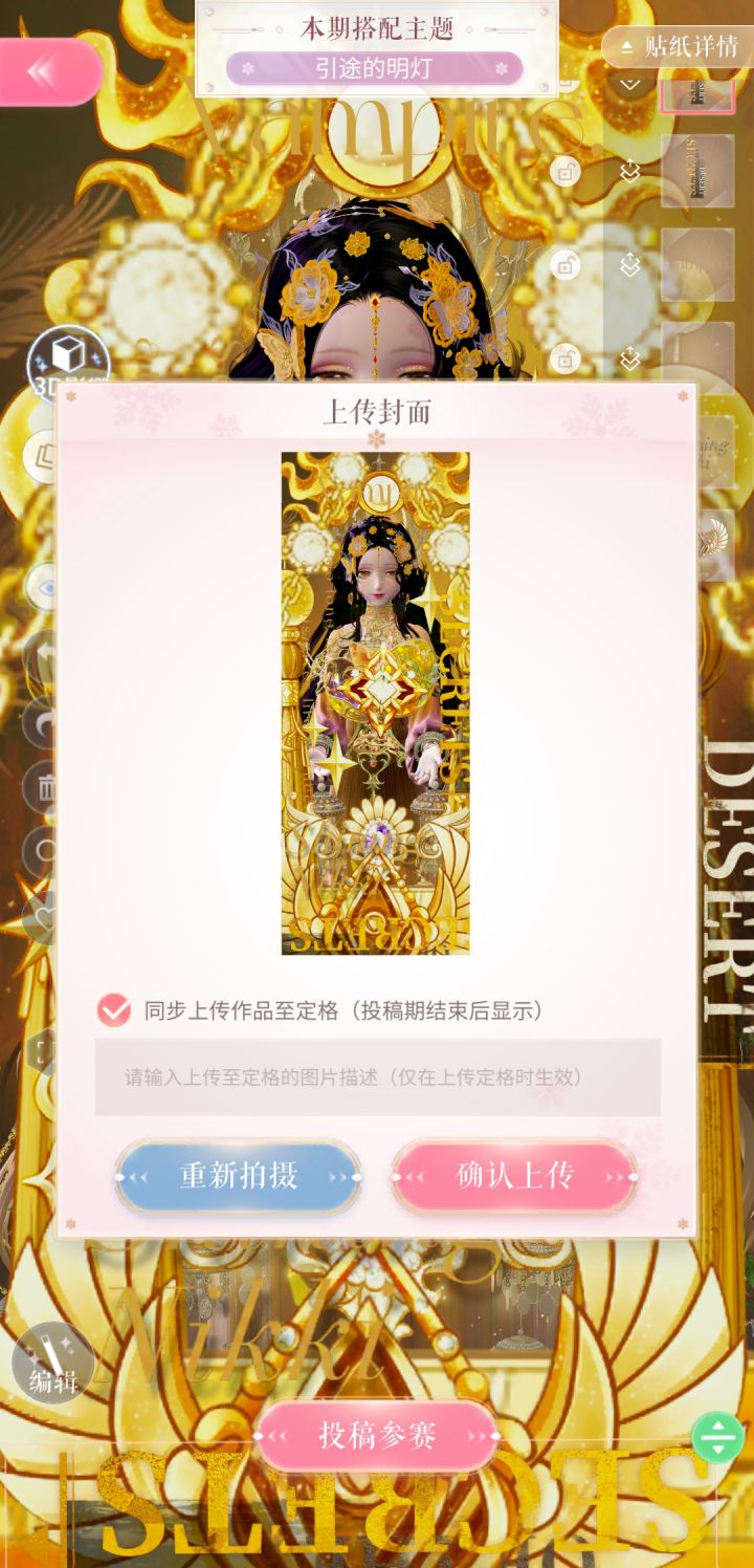 搭配码:Nikki-18abATqpHHkG3Z滤镜风格:黄的 亮的贴纸选择:金黄的,对称的高分tips:亮的清晰的,不要雾蒙蒙的,如果是和我的一样黄色的就越黄越好。如果是别的风格也要注意要亮一些,贴纸放大形成类似框一样的。最后加点毫无意义的字体就行。#闪耀暖暖搭配赛 #闪耀暖暖