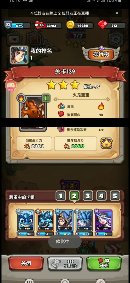 组合:狮鸠兽,狼骑士,妖精适合人群:50+以后,我相信大多数朋友会这么想:为了刷成就心累,过关的同时又想混几个成就,又想拿个三星,刷个多次又浪费体力,还不如卡关后回头慢慢刷,总觉得各种亏,被机制折磨到自闭。核心思想:能打到五十+的朋友应该都会用技能(不会的多打打挑战),叠到最大伤害收手(就是这么任性),狼消东西,狮交换,妖精强行升级,有卡等的朋友还能利用交换消除升级指定卡(我只有狼有被动),目