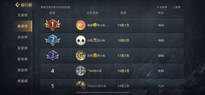 战况激烈的巅峰赛预选赛已经如火如荼地进行到了第四周,各战队也是把自己压箱底的操作和杀手锏掏了出来!这周又有哪些精彩的名场面呢?让我们一起来欣赏一下吧!能够挤进前十名的战队都不简单;可有你的战队或你支持的战队呢?!羡慕他们这样默契厉害的战队么?你也想拥有么?听说分享游戏给身边的朋友,一起组建战队开黑,更容易上分哦!!!