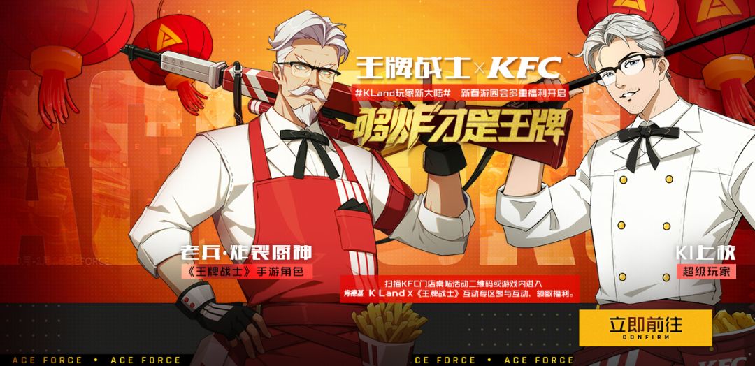 女士们,先生们:大家好,我是K Land主理人KI上校1月10日(就今天),《王牌战士》x 《肯德基》全新新春炸鸡桶已正式登场!作为主理人的我,就来跟大家讲讲,这背后的故事……(对,你没有看错,我就是KI上校!)这次给大家带来的全新时装“老兵-炸裂厨神”适配选手为“老兵”。据可靠消息,他是一名狙击型选手,擅长精确瞄准射击;穿上这套时装之后,选手“老兵”可以呼叫“炸鸡炸弹”从天而降,造成地
