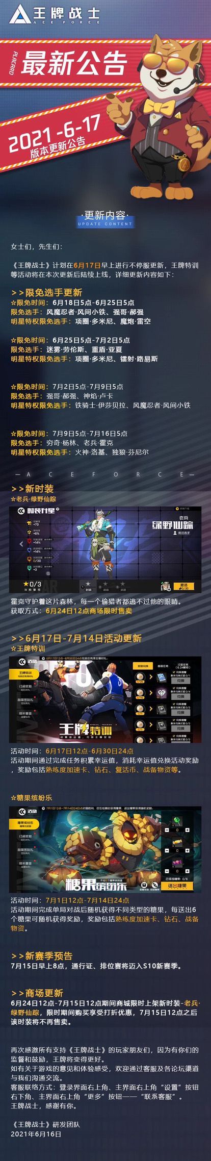 女士们,先生们:《王牌战士》计划于7月15日早上进行不停服版本更新,本次主要更新内容是S10赛季的开启,同时王牌战士即将迎来上线两周年生日,我们特此准备了英雄免费福利回馈玩家,请关注我们的后续的公告了解福利详情!>>S10新赛季☆排位赛S10赛季开启时间:7月15日8点S10赛季排位赛奖励:梅花二段至主教五段之间一共可领取点券X150、战车二段至战车五段之间一共可领取限定扭蛋币X2、皇后