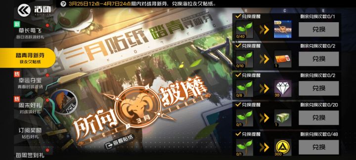 女士们,先生们:《王牌战士》计划在3月25日早上进行活动更新,踏青寻新芽--获永久贴纸、幸运夺宝--青春时装返场两个活动将在本次更新后上线,详细更新内容如下:>>限免选手更新☆限免时间:3月26日5点-4月2日5点限免选手:收割者·海拉、穷奇·杨林明星特权限免选手:魔炮·雷空、蝶·???>>活动更新☆踏青寻新芽 获永久贴纸活动时间:3月25日12点-4月7日24点活动期间在指定模