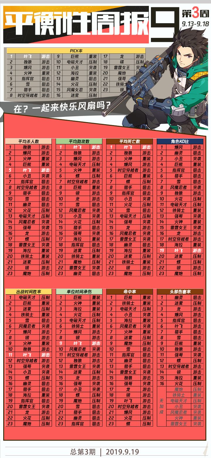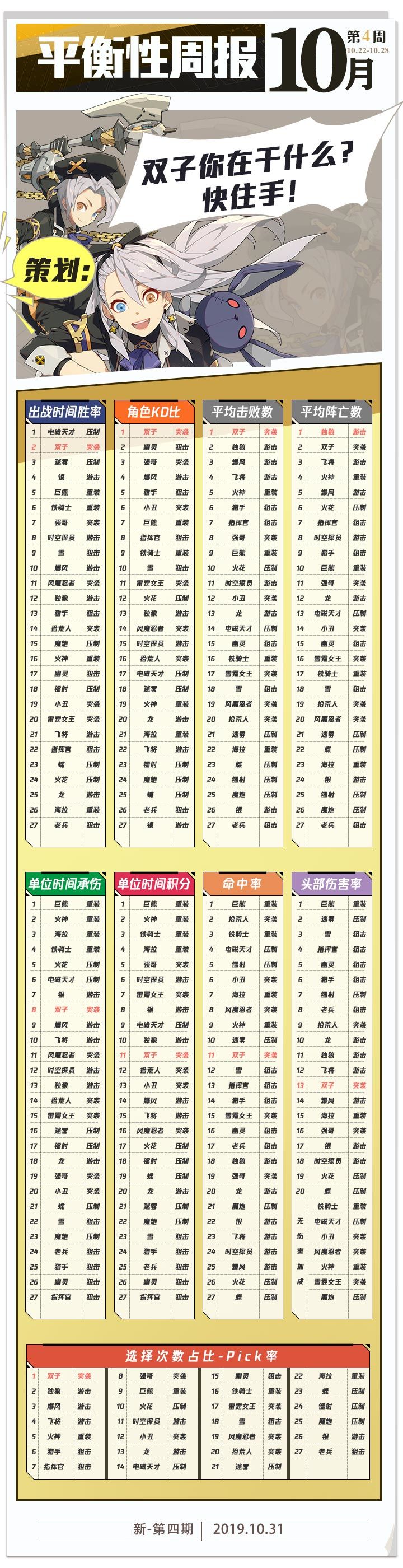 小伙伴们大家好,好久不见了,我是王牌战士的制作人。因为10月24日版本发布前后的工作略多,没能及时回复大家的一些问题敬请原谅。这段时间我一直在关注玩家社区和论坛上各种玩家的反馈,同时我们内部也对当前的版本进行数据分析和用户调研,除了目前定位到的很多新问题,之前已经暴露出来的老问题也在持续修改,今天就这些问题跟大家交流一下。首先,关于平衡性。在这里先向这几天被双子摩擦和没能抢到双子的同学们道