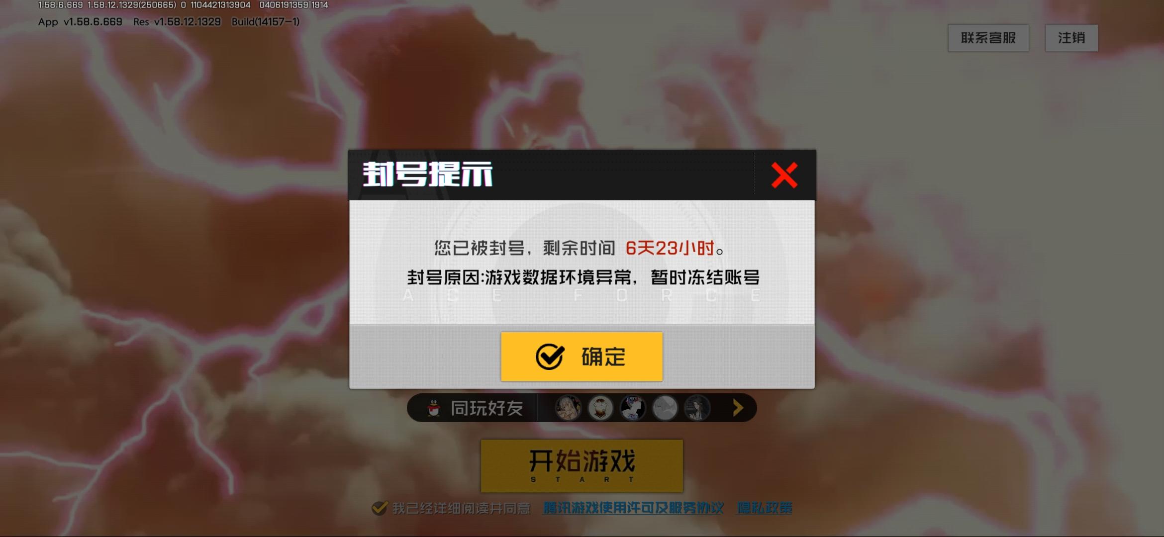 我tm又异常掉线封号了。三月封了三次,四月这开头又封了,让不让人正常玩了,就算封你丫一封封七天......... 我tm月卡、通行证等都耽误了,你异常就检查啊,封这么长时间干嘛而且客服之前解封后才收到 ,现在怎么解决