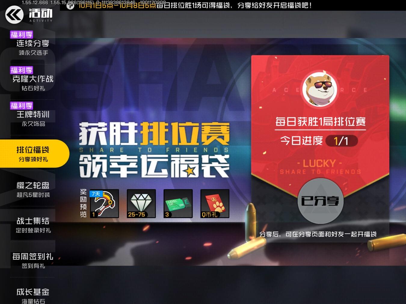 排位福袋那个奖励,我分享了之后显示我网络延迟,没有分享出去,但是回到游戏活动那里显示已分享,可是奖励领不了啊有没有办法抢救一下。主要在意那个升级通行证的