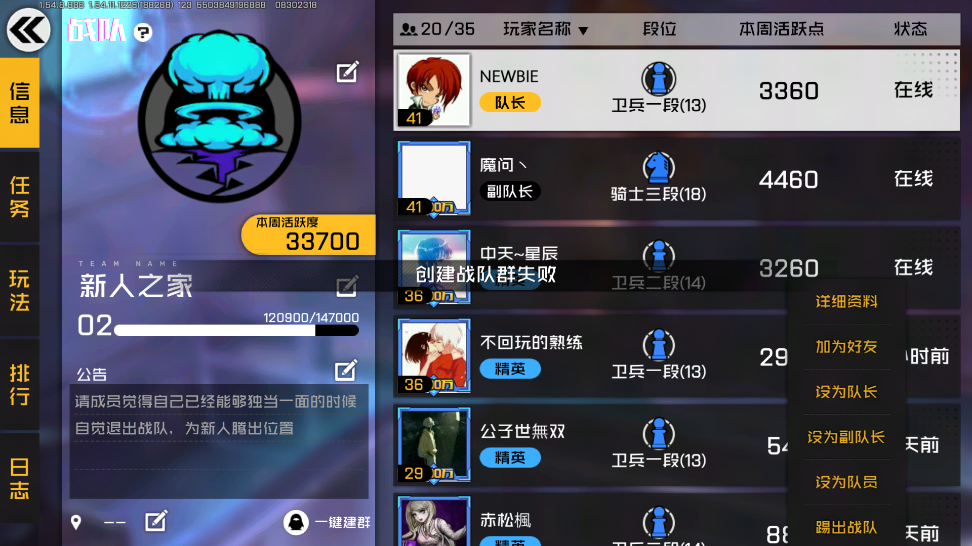 之前我闲的没事创了个战队,然后某一天心血来潮点了那个一键建群,但是我觉得没啥用也没啥人,于是没有通知别人,又给解散了,今天我们一个副队长提醒我让我建群,但是我再点一键建群却提示建群失败,我转移了队长再建群也还是失败,我想问一下,这个属于什么问题?能解决么?