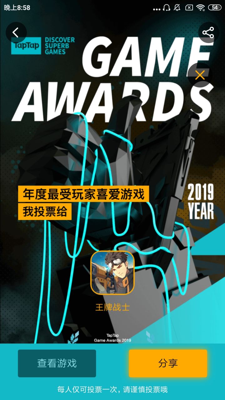 (【王牌战士】预祝您2020一切顺利!TapTap年度游戏大赏进行中,欢迎投出小票票救救孩子!)我急忙打开TapTap,投上了一票,心中带着(看晚会忘了啥感觉了)写下了这些。真的喜欢这游戏,奈何手机不行了,还是告别了,但我不希望他就这么。。。(不会形容),说一句中二的话:展现你的强大吧,王牌战士!