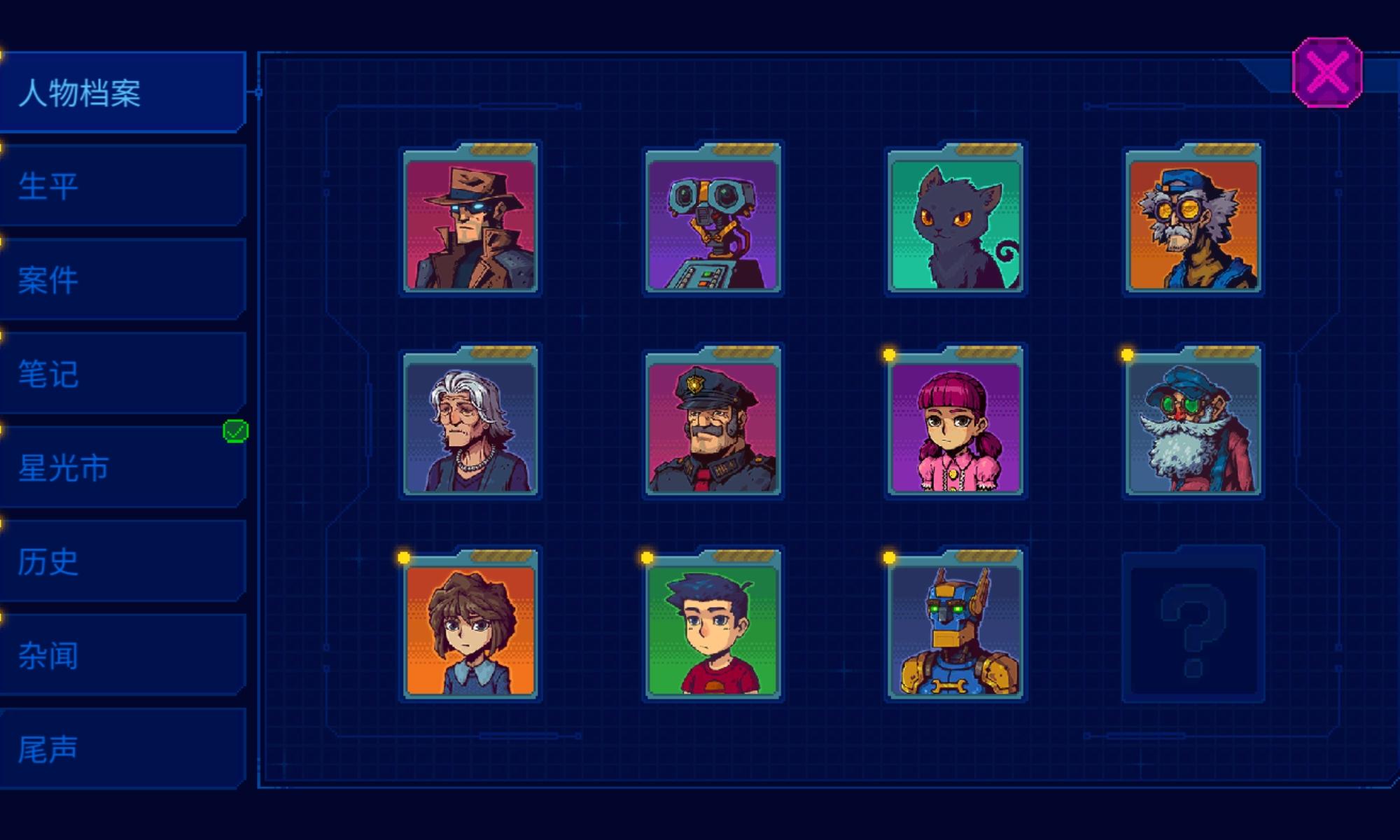 绝了,打了一周,期间也有实在过不去查攻略过得,非常非常良心。制作精美,像素风格的解密游戏,让人眼前一亮。案发现场,普通视觉和侦探视觉相互切换的创意也很新颖,剧情环环相扣。总体体验非常棒。音乐配的也非常传神,调查的时候,音乐让人听起来就很紧张,细节处做的非常的好。推荐推荐推荐推荐