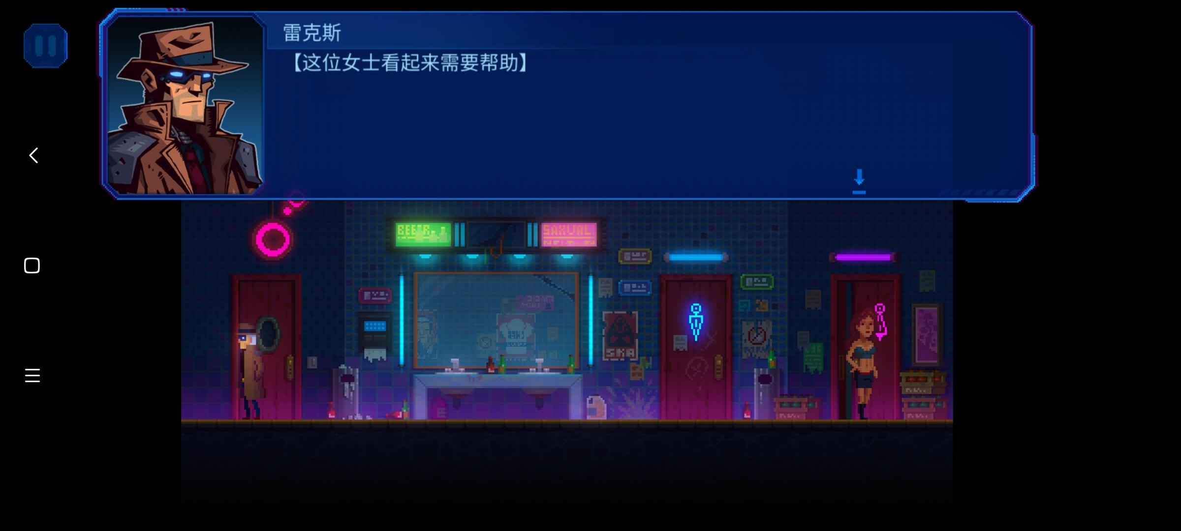 ㅤㅤ虽然游戏只是2D像素画面,但是其画面依旧特别亮眼:ㅤㅤ游戏使用的色彩对比强烈,而灯光多使用了柔和度偏高的渐变效果,营造出了一种梦幻的感觉。整个画面中硬朗的线条和柔和的灯光搭配在一起,不仅毫无违和感,而且还加强了笔者对该世界的代入感。ㅤㅤ正因为有这么多优秀的画面元素,才组成了游戏中一幅幅精致漂亮的画面。甚至有人称,《迷雾侦探》的画面就是赛博朋克风格的《清明上河图》,可谓是赞誉有加了。