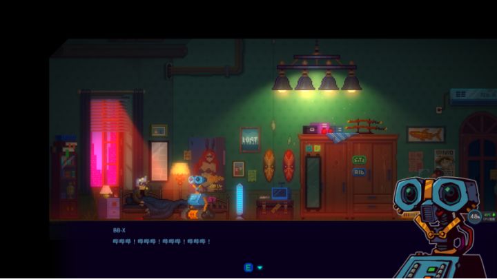 平常一天的日常时间:2140年10月20日,星期四,中午故事倒叙回了三天前,家用机器人BB-X喊我们起床进行检查,发现我们的机械部件都处于崩溃的边缘,弹出我们的扫描结果,这里可以随意点击各部件进行查看。一番斗嘴后,主角表示待会再去工作间走出房门,来到三楼,这里停电了,盔甲正在闹鬼。拿上钥匙,然后去二楼的楼梯间修电箱。打开二楼的电箱。进去配电小游戏,需要让两个点口通过电路链接,我们给每个按