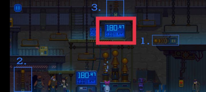 下图标记的1、2、3是三个电磁塔的分布情况。任务是将下图三个按钮加起来的和等于上图红圈部分。举个例子,上图红圈部分的数是180.47,那么三个按钮调的数加起来必须是180(只取整数部分),调好后要拉一下按钮旁的拉杆。显示屏由红色变为绿色说明调对了。这里建议将按钮先调成上图这样(从0开始),然后每个按钮都调一次看看代表的数是多少,再做计算。此外,蓝色显示屏会改变三次(图中由180.47变为21