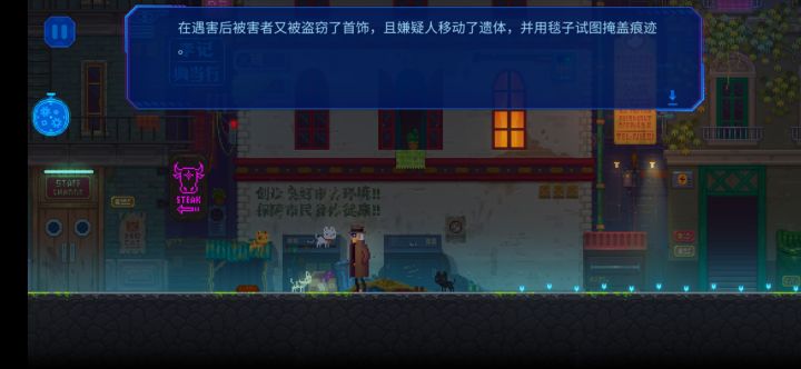 迷雾侦探是一款十分好玩的像素剧情冒险解谜类游戏,玩家需要化身为一名侦探,然后在这个赛博朋克的未来世界中进行调查案件,而您需要通过勘查现场、分析物品以及询问NPC等一系列的手段来破解解谜一件又一件的案件。该游戏将科幻以及侦探元素的相结合,并且这个背景也是设在高机械化的未来世界,并且这个主角也是是一名职业的侦探,玩家在这个调查案件的过程中,也是会遇到各种各样的解谜要素,还要应对来自敌人的威胁。在迷雾侦