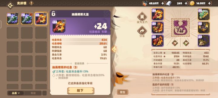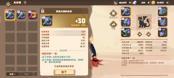 由于本人四次测试都是玩吐息龙的,所以给大家带来吐息龙装备养成推荐。吐息套装分为紫色套装和橙色套装,三件套吐息加成,六件套有额外的套装效果。前期可以先凑齐三件套紫装,等通关秘境后可以凑三件套橙装加三件套紫装,六件套橙装比较难刷出来。吐息输出装备选择,翅膀位置选择生命加速度,尾部可选择奇袭+吐息攻击或吐息增幅,项链选择生命+吐息增幅或吐息攻击。以上装备属性为最优选。装备副词条优先选择吐息攻击和吐