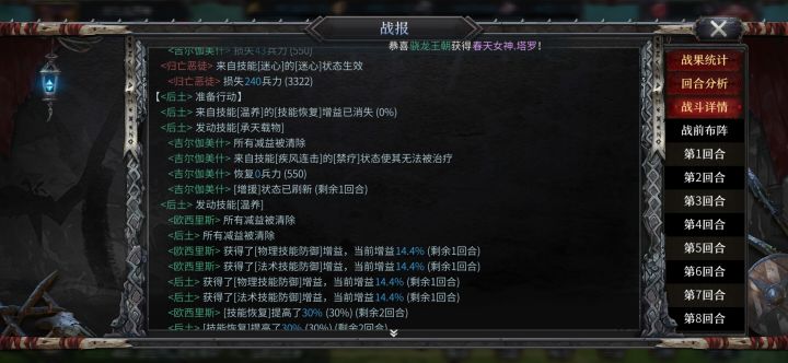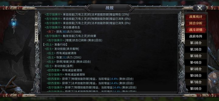 后土技能bug,技能描述是移除负面状态和减益效果,实战中只有移除减益效果,下面两封战报中后土发动技能后都只有移除减益的描述,事实上罗宾汉附加的禁疗也没被移除。