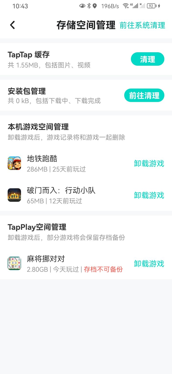 玩这个游戏有一段时间了,突然发现taptap占用特别大,我想平时也不怎么玩游戏啊,就发现了这个内存刺客。一个益智类“小”游戏。占了我快三个G。不知道是玩过的那些关卡,还是误触点击的广告安装包?想清理还存档不可备份。被恶心到了,希望早点优化吧。#麻将挪对对