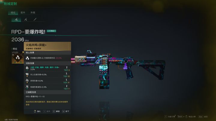 相信有很多小伙伴刚入坑不知道怎么玩,我说说要爆炸配装(仅我个人自己配装)首先是武器配件选择,枪口用锤头型补偿器,瞄具用紧凑型反射式瞄具,战术用战术型激光指示器,弹夹用轻机枪大型弹鼓接下来是武器模组选择这里我们选择使用火焰共鸣头盔使用异常专家面具使用重度烧伤上衣使用快速返场裤子使用元素共鸣手套使用元素强化或者是异常强化鞋子使用掩护备战然后是摇篮方面直接看图选吧其中异想联翩可换成能量涌