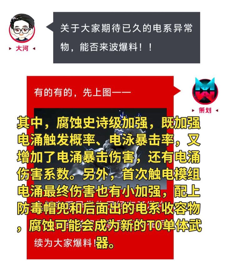 武器数值调整,一共5把枪进行加强。其中,腐蚀史诗级加强,既加强电涌触发概率、电泳暴击率,又增加了电涌暴击伤害,还有电涌伤害系数。另外,首次触电模组电涌最终伤害也有小加强,配上防毒帽兜和后面出的电系收容物,腐蚀可能会成为新的T0单体武器。#今天游戏圈发生了啥 #七日世界 #七日世界畅所欲言 #七日世界攻略 #七日世界手游测试 #七日世界特别邀请码 #七日世界问题反馈 #七日世界帷幕测试 #七日bug