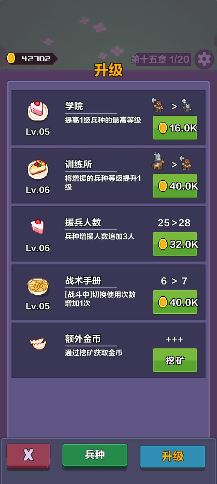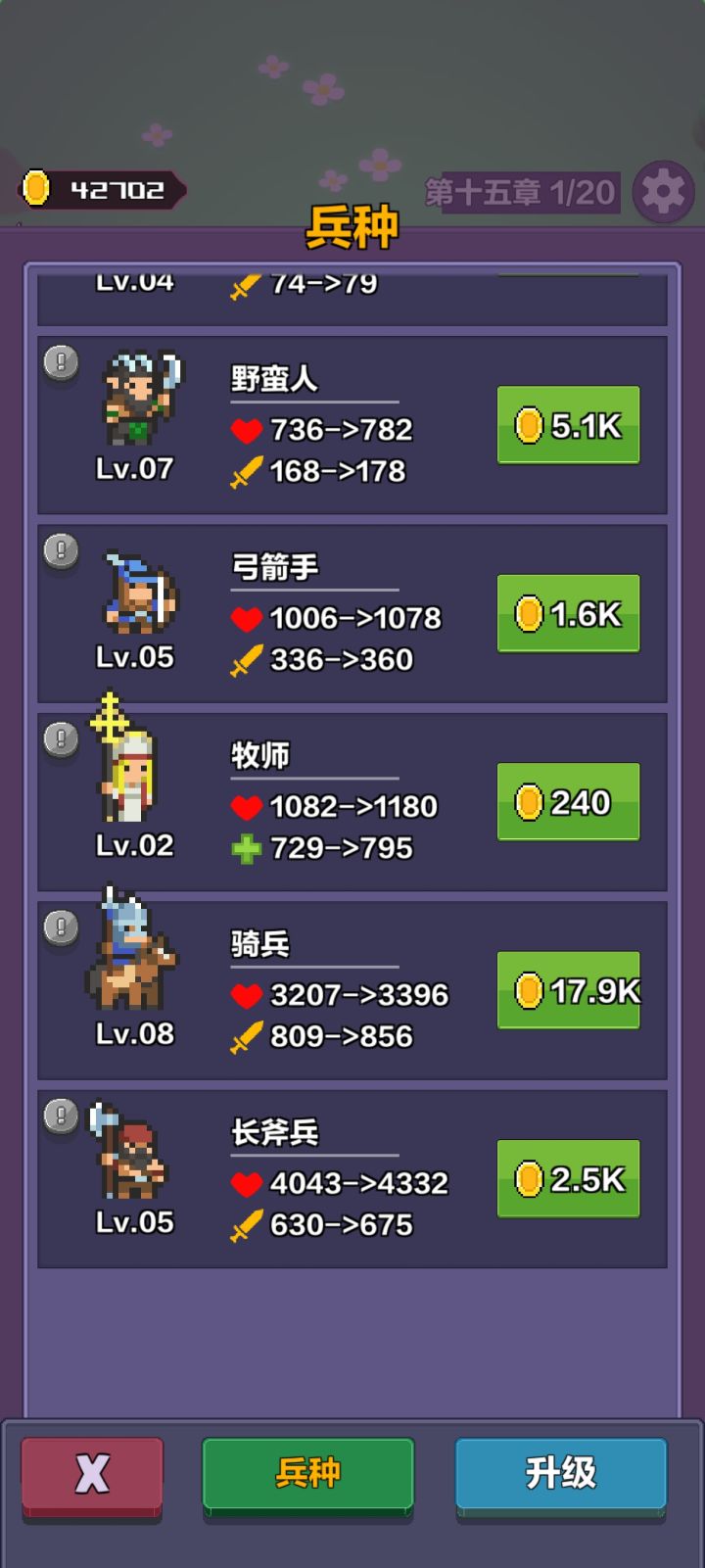 注:兵种升级后,每升1级血量与攻击提升基础属性的10%,每次升级花费金币是前一级的2倍(指数增长太恐怖了…还好合成高级兵种给的金币也多)后期打法主要还是前排肉后排多带牧师,建议多强化一下牧师与高级兵种