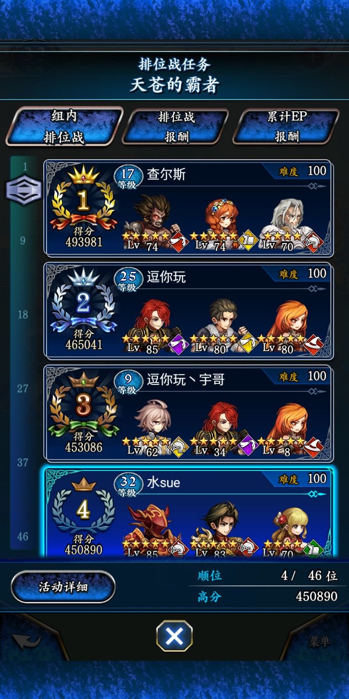 今晚7点左右开始,我就在练习这次排位拿高分的方法(我有发一个莽过去49s的视频)再练习差不多1h后,突然幸运的在45s3300负伤胜利了,拿到了第一,然后我就开始录视频证明了。可还没等多久,龙耀扬就和上次排名一样的方法(就是比第二名快两秒和少500负伤?(之前第二的桐生刹那是1分06s、500负伤))在43s、2800负伤得到第一(而且还是和开挂被封3天的队伍一样是三个骑士,如图:实锤第一次活动开