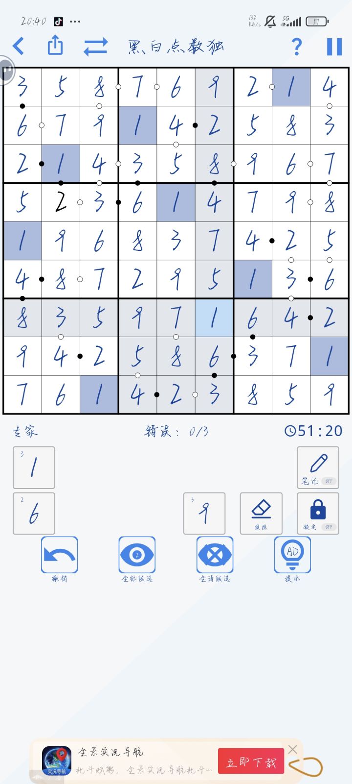 1.数字3和8点击范围与图片不符合,实际上要稍微往左才能点击到,我之前以为屏幕有问题或者卡住了。2.本人视力有些不好,能不能把各种异形数独的边界弄更方便一些,很容易看错,并且眼睛花的厉害,可以的话边界或者数字,符号改下颜色,或者增加一点对异性明显的皮肤照顾一下我们这种视力不好的人。3.难得因为一款游戏评论,一般游戏如果不是玩的下去的基本就卸载了。