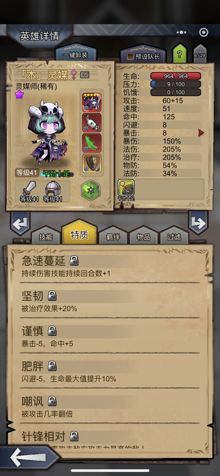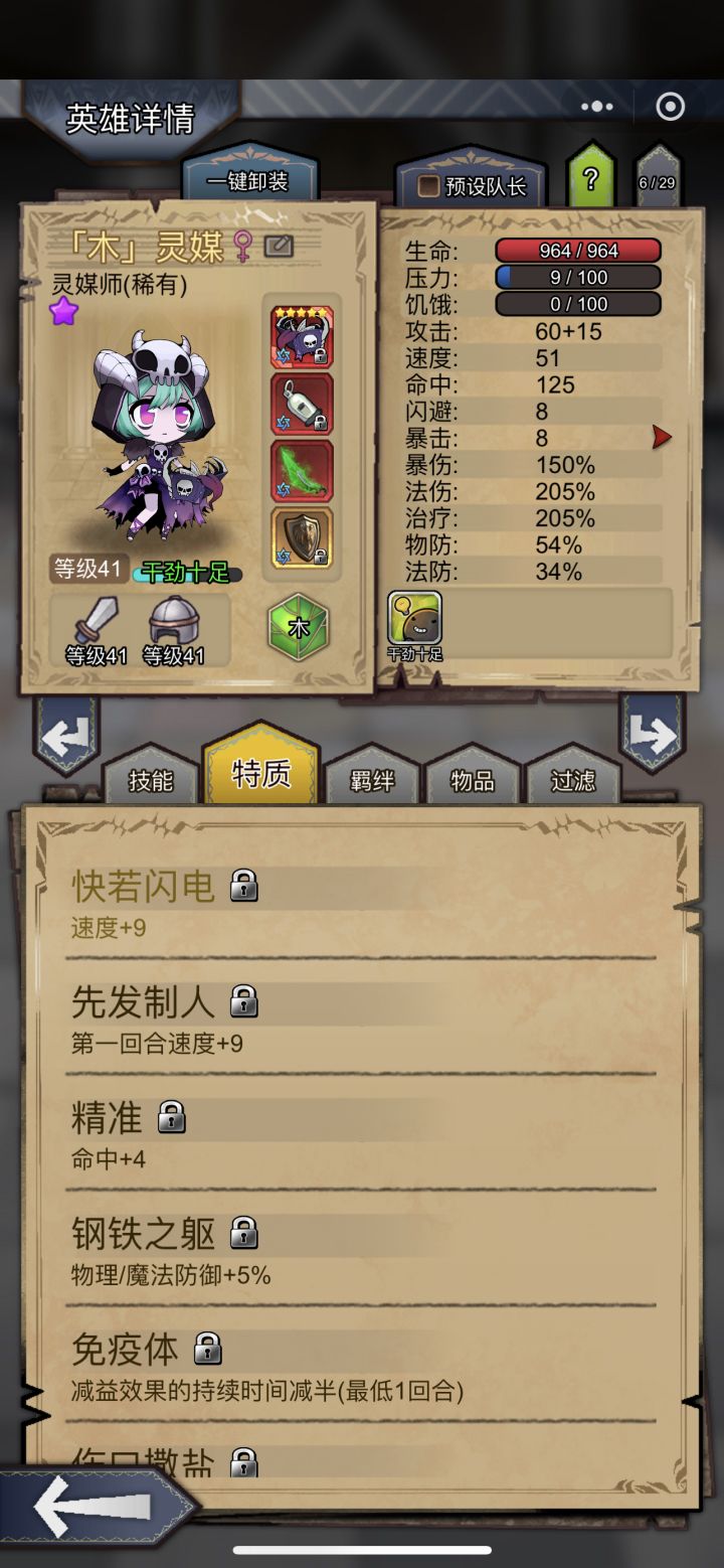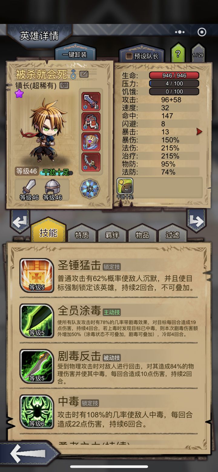 玩了3个月目前一万周一点前期小心得分享下此攻略只对前期资源匮乏的萌新有点参考价值 高配大佬可以直接跳过!此阵容适用于装备不齐全 物防不达标 适当有些基础的玩家 只需核心装备各角色5星专属 绿刀 哨子 连击刀即可 其他装备都可替换 各角色除灵媒外需要物防65 魔防50即可 防御越高越好避免buff中断突然暴毙阵容 镇长(物防没满95中毒技能可替换为神圣祝福,镇长需要速度比灵媒慢,比骷髅快就