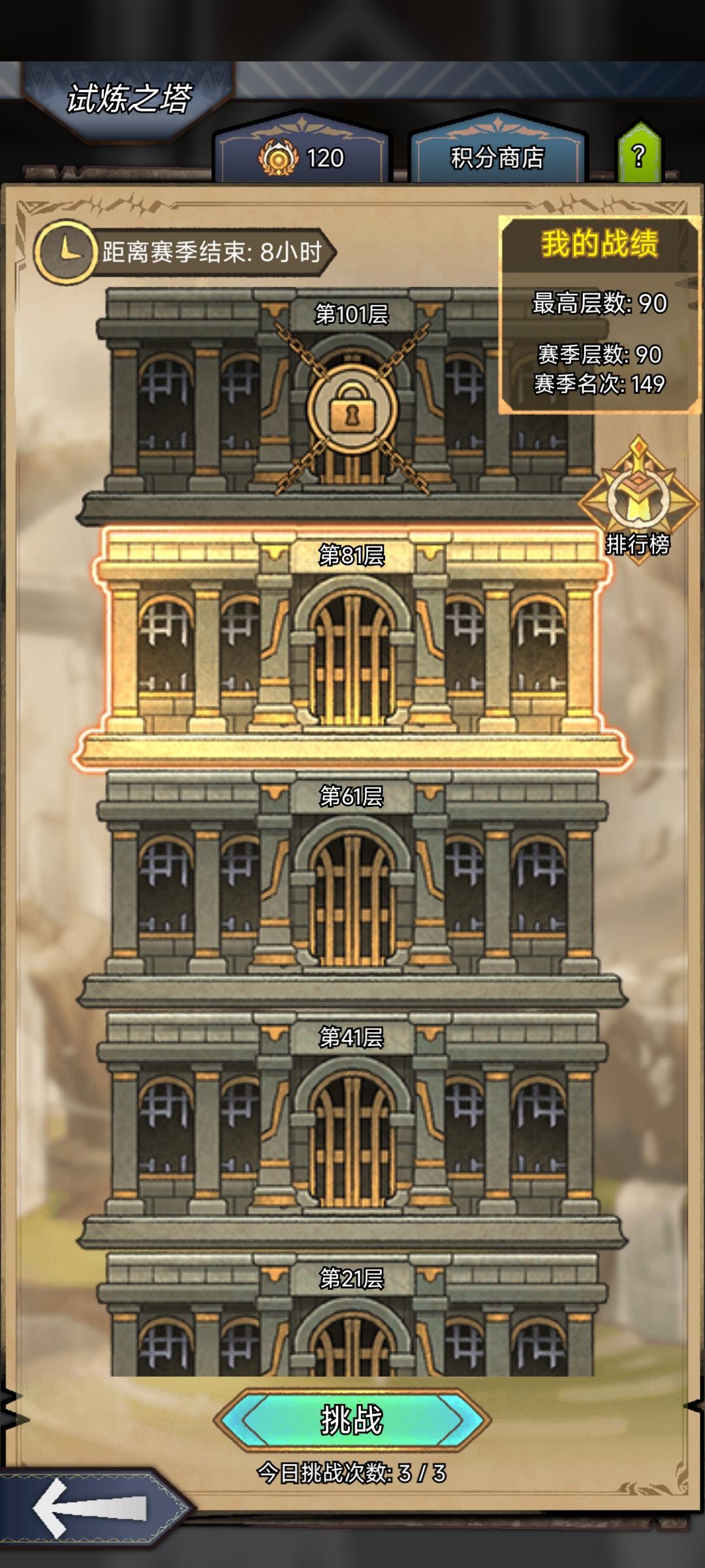入坑三天第一次打试炼之塔,分享一点踩过的坑和实操细节。1.进塔前,主力全换上战斗力强的装备,加背包格子的装备给闲置人员都穿上。因为试炼塔会掉落材料和金币,背包尽量多,不上场的闲置人员带背包也是有效果的。2.权杖给上场的主力带上才生效!3.进塔前镇长记得换辅助天赋,带好牛排。4.不用买食物,买药水就行了。5.阵容推荐:法/辅镇,灵媒,圣骑,神官,医生(一星医生有点菜,可以换别的,海潮或者猎