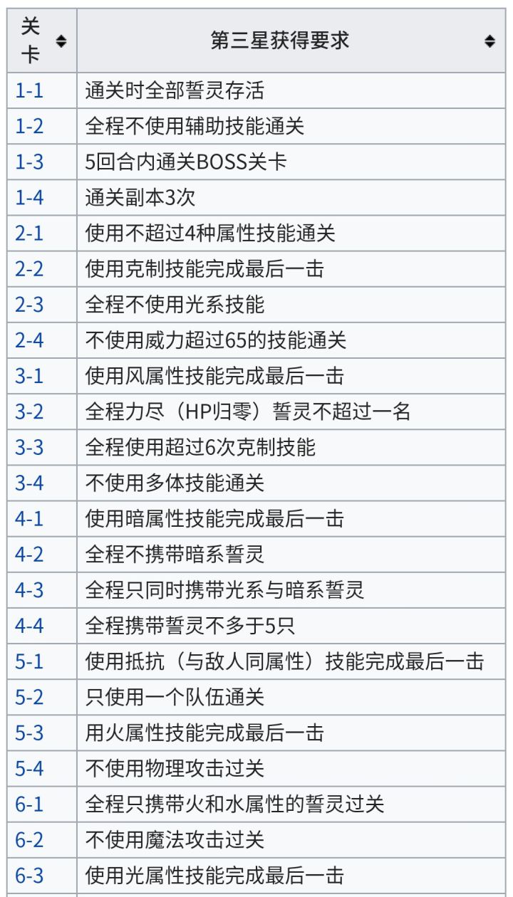 1-1 通关时全部誓灵存活1-2 全程不使用辅助技能通关1-3 5回合内通关BOSS关卡1-4 通关副本3次2-1 使用不超过4种属性技能通关2-2 使用克制技能完成最后一击2-3 全程不使用光系技能2-4 不使用威力超过65的技能通关3-1 使用风属性技能完成最后一击3-2 全程力尽誓灵不超过1名3-3 全程使用超过6次克制技能3-4 不使用多体技能通关4-1 使用暗属性
