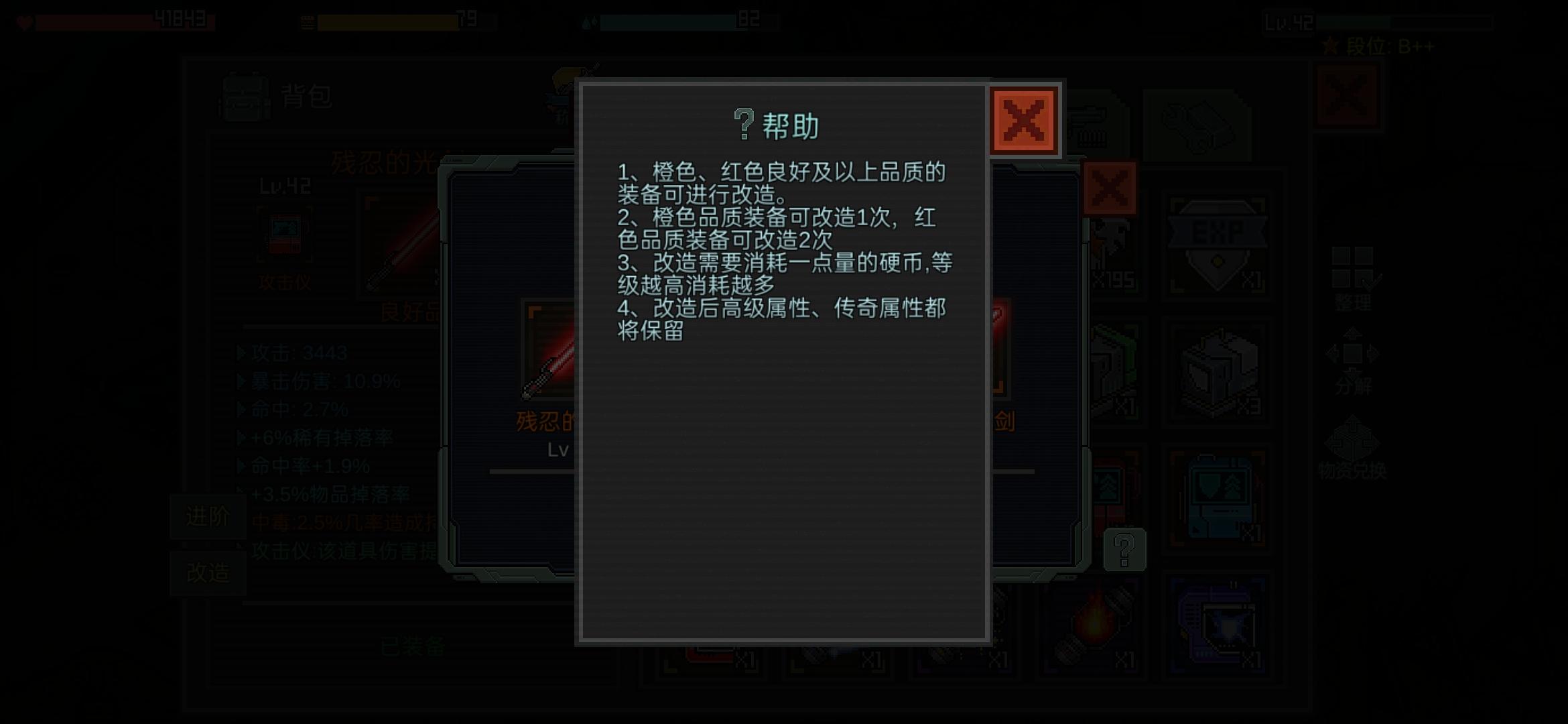 良好以上橙红装可以通过改造升10级,但是会降低品级,游戏里没有写出来。完美级的红弓改造一次变成良好了,还有前缀套装改造后会消失也没说明,枪神前缀的头盔改造后变成普通的橙盔了。
