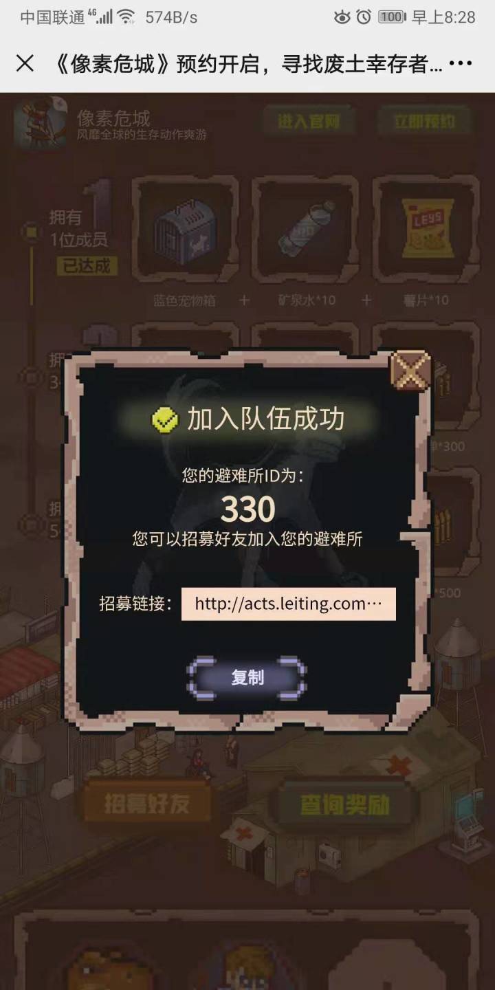 再来两人我的避难所还差2人,赶紧加入我的避难所,一起在这废土上生存下去吧!http://acts.leiting.com/xswc/202011/reserve/?teamId=d228a6a06eb62308&inviterId=1e7b32089e4fb1468c588e2963b90c1146488