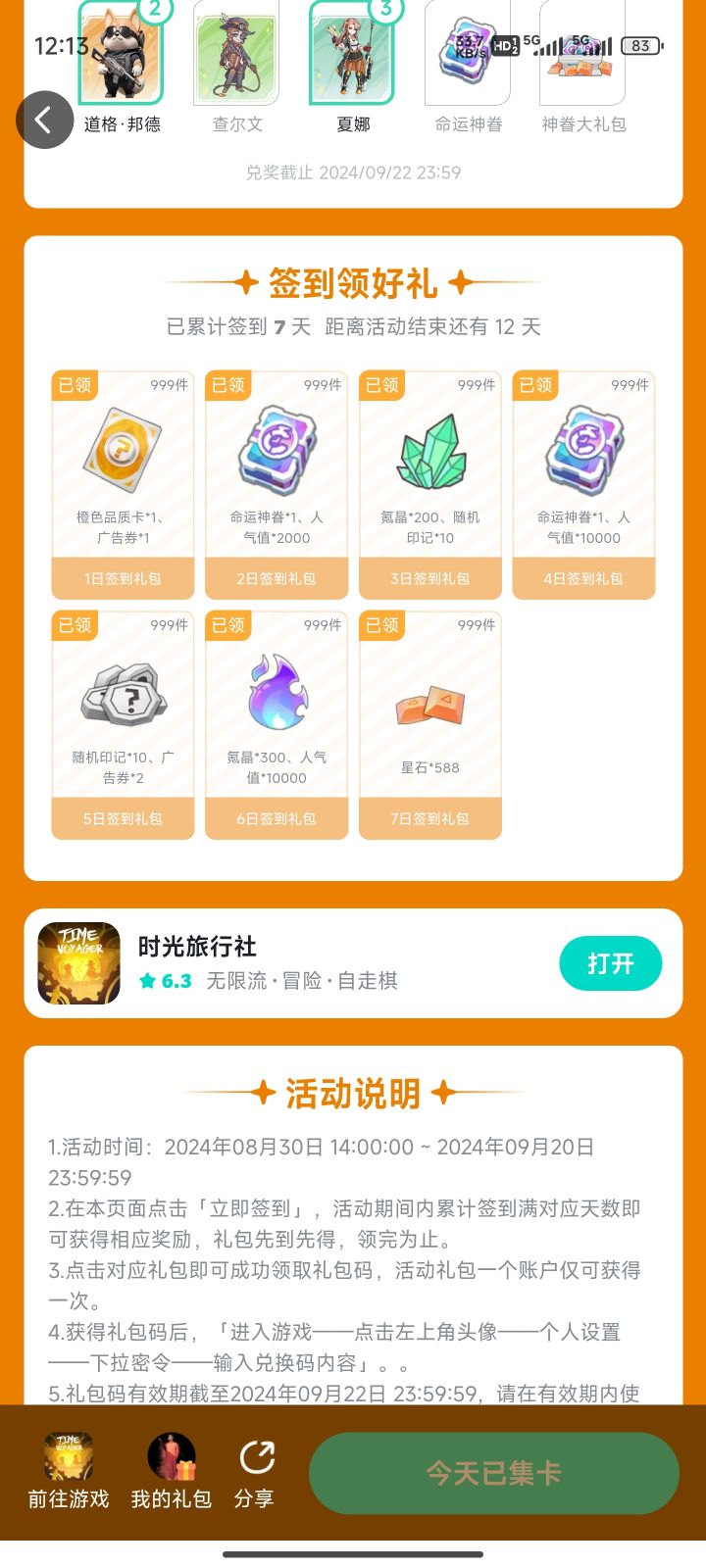各位开拓者们好~这里是敲爱你萌的美少女娜娜~今日《时光旅行社》正式开业啦!娜娜为大家带来了签到福利活动~在享受旅途的同时,别忘了每天前来签到领取哦!!「活动时间」2023年12月22日~2024年1月20日23:59「参与方式」「奖励预览」#游戏安利#游戏推荐