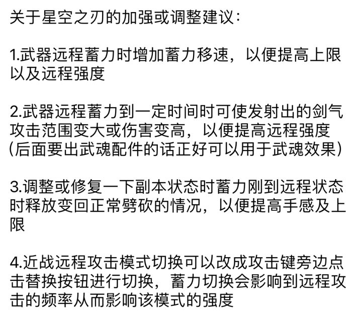 首先重要的事说三遍:加强星空之刃!加强星空之刃!加强星空之刃!首先武器本身强度是有的,但价格偏贵对不上这个强度,且定位尴尬,图2为豪猪提供的一些加强方向建议,希望可以拿去参考一下微笑终章多加一些联机副本————已经很长一段时间没有出新的联机副本了,在线上模式出之前想要保持游戏内玩家的互动率就得多弄一些联机副本,最好能带来新机制,新的创新(普通的也行,至少要有),至于副本掉
