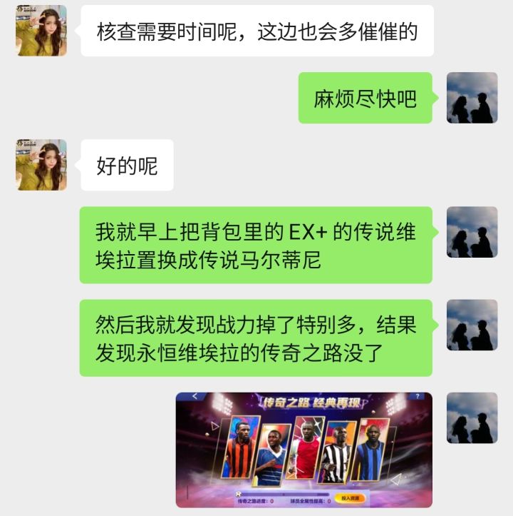 #全民冠军足球 #全民冠军足球老六 老六进来看看吧,这就是你们对待游戏,对待这个工作的态度吗?做个代码还要偷懒,复制代码后看也不看。 12月12号,置换活动出来后,因为我阵容里已经有ux永恒维埃拉,包里有个ex+的传说维埃拉,反正放那也是浪费,我就把包里没用的ex+传说维埃拉给置换成马尔蒂尼了,结果置换完后就发现战力掉了很多,找了半天发现是维埃拉的传路没了,我就第一时间去找了客服莎莎,莎莎说