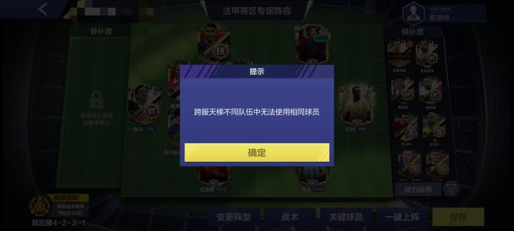 #全民冠军足球老六 我想在法甲赛区换下小贝,换上小法,结果保存不了,小贝明明不在法甲阵容了,为什么还提示已上阵同名球员?bug什么时候能修复