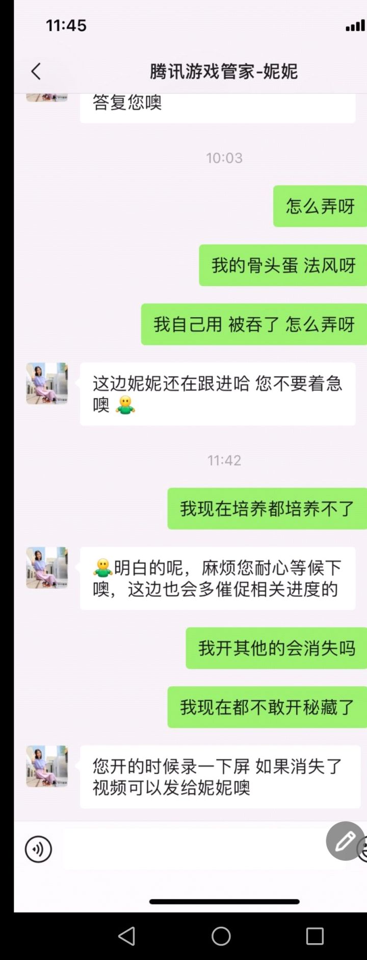 这就是你们客服处理的方式吗?我玩个游戏还要24小时录视频吗?你们游戏做的真他妈漂亮,这种bug出了好几天了,到现在依然没解决,连个公告都不敢发