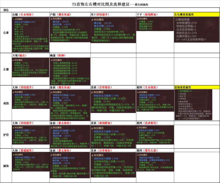纯属无聊整理分析,欢迎指正:先看对比图(红色字为装备特色描述)1.左曹最好选:输出职业选万鬼,纯奶选幽邃,毒奶选万鬼;2.右槽也好选:持续输出职业选朱7(比如居合),爆发职业选户隐(比如天珠),但参考65套的衰减套十握,整体表现并不好,我作为天珠可能也会考虑朱7;山城是奶妈玩的;千手太过常规没有亮点,稳定但没特色,等待成品测试。3.首饰要搭配:输出套——备前戒指+相州护符+美浓佩饰。分析