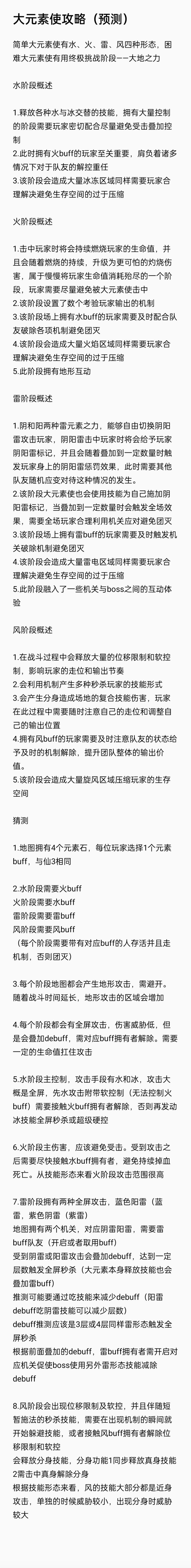 根据目前已有大元素的信息做了一个简单的技能预测,下周攻略更新后会同步更新。另外找个14万以上会玩听指挥的奶妈开荒大元素😎
