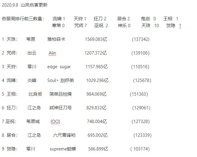 今日9月8日业鬼山岚 装备毕业 各职业巅峰伤害统计