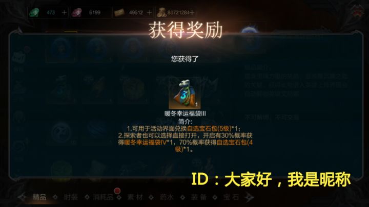 今天下午正式开服后,令大家疯狂的暖冬幸运福袋活动也随即开启。你是得到天使庇佑的欧皇?还是中了恶魔陷阱的非酋呢?不管你的开袋结果如何,来这里留言都有可能获得1级暖冬幸运福袋,说不定这是你成为欧皇的契机哦~一、活动规则(1)按下面的回帖格式直接回复本帖即可,晒晒自己的开袋结果,或者说说你在继续开袋和保守兑换之间的抉择经历,最后配上开袋截图。(2)回帖时请留下你的游戏ID相关信息。回帖格式如下