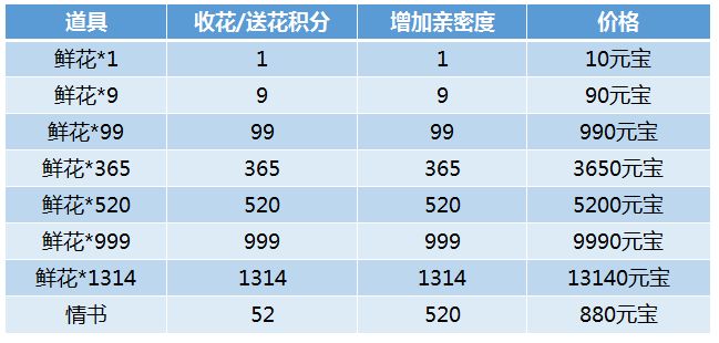 随着情缘系统的上线,又开启了一个新的功能——送花。斗者可以将鲜花送给本区的任何人,若对方是您的好友,则会增加亲密度,并且在个人信息页面可以看到历史收花积分和历史送花积分。每赠送1朵鲜花可以增加1点送花积分,每收到一朵鲜花可以获得1点收花积分,若赠送元宝商城购买的“情书”则可以获得52点送花积分,如果互为好友可以增加520点亲密度。在排行榜上又多了收花榜与护花榜等排行榜,分别有今日收花榜/护花榜