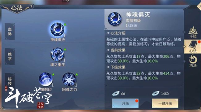 心法可以为斗者本身永久增加各项属性,分为血脉、绝学和秘技三种,斗者到达一定等级后就可以对心法进行升级。职业不同,心法所增加的属性也就不同,今天为大家带来的是魂族的心法解析,快来一起看看吧!血脉与绝学各有一种技能,是通过银币进行升级的;秘技有两种技能,需要通过金币进行升级。血脉技能神魂俱灭:永久增加土系攻击17点,最大生命306点,物理攻击30%,最大生命10%。绝学技能魂之重生:永久提升水系