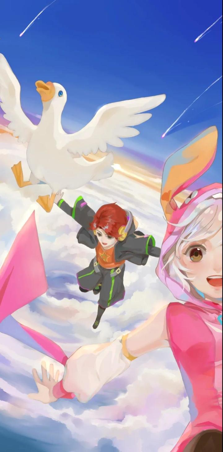 哈喽大家好!我是大鹅最近夏天来了也该换个壁纸换换心情啦!你们看大鹅我怎么样?鹅有很多帅气的照片都很适合做壁纸哟——所以,今天鹅要带来一期壁纸特辑首先感谢画师「南瓜」本篇文章中所有的壁纸都出自南瓜之手哦!这一张,画了兜兜、博特和鹅在云上飞翔的样子。虽然大鹅不会飞,平时只会扑棱翅膀,但鹅在梦里也曾飞上过天空,那样的感觉真是太美好了!这张壁纸中,大鹅拥有了一个荷包蛋外形的气球,虽然